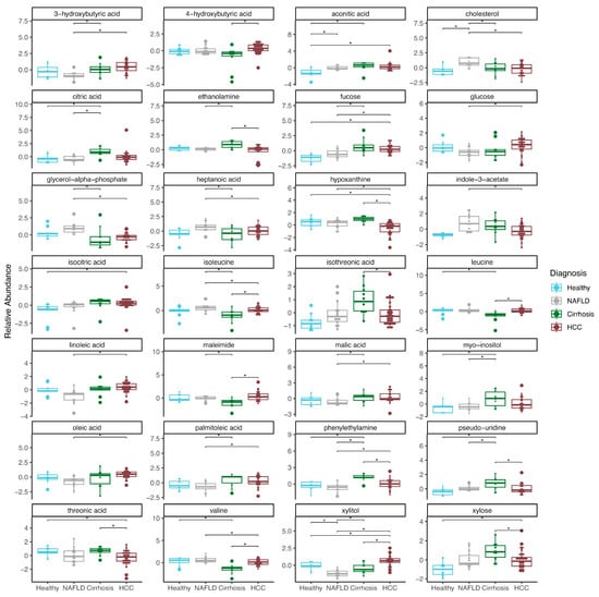 Plasma metabolomics from individuals with healthy, NALFD, cirrhosis, or HCC livers. Boxplots depicting the relative abundances of metabolites and significant associations among pairwise disease comparisons (* FDR p < 0.1).