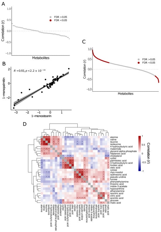 Metabolite correlations between and within saliva and plasma biofluids. (A) Scatterplot depicting correlations of relative metabolite abundances between plasma and saliva samples. No metabolites met the significance threshold of FDR p < 0.05 (red). (B) Correlation of 1-monopalmitin and 1-monostearin relative abundances within saliva samples. (C) Scatterplot depicting correlations of relative metabolite abundances within plasma samples. Significant correlations (FDR p < 0.05) are depicted in red. (D) Heatmap depicting clustered relative metabolite abundances within plasma samples. Heatmap colored by correlation (r). Asterisks depict significant metabolite correlations with an FDR p < 0.05.