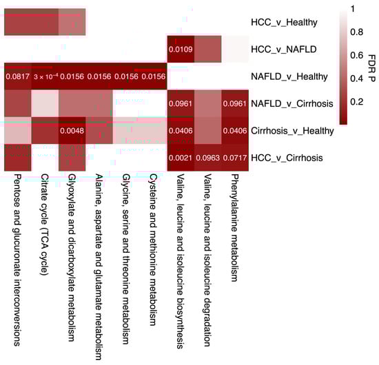 Over-represented pathways in liver diseases from plasma metabolomics. Heatmap depicting FDR of KEGG pathways over-represented in liver disease comparisons. Significant pathways (FDR p < 0.1) are depicted by numerical FDR values.
