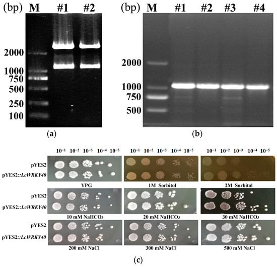 Guo, J.; Zhao, Y.; Cheng, H.; Yu, R.; Gu, B.; Wang, Q.; Zhang, J.; Li, S.; Guan, Q. Enhancing Plant Stress Tolerance: The Role of LcWRKY40 Gene in Drought and Alkaline Salt Resistance in Tobacco and Yeast. Int. J. Mol. Sci. 2024, 25, 10149. https://doi.org/10.3390/ijms251810149