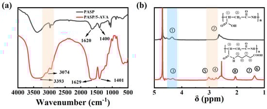 Infrared (FTIR, (a)) and Nuclear Magnetic Resonance spectra (1H-NMR, (b)) of PASP and PASP/5–AVA.