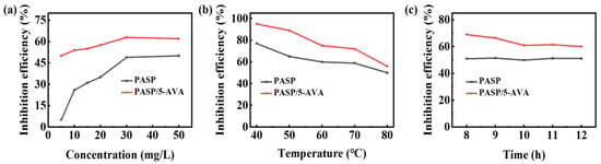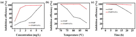 The anti-CaCO3 scale efficiency of PASP and PASP/5–AVA. (a) With different concentrations; (b) Different experimental temperatures (the dosage of inhibitor is 30 mg/L); (c) Heating time (the dosage of inhibitor is 30 mg/L).