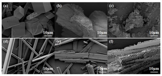 The morphology of CaCO3 (a–c) and CaSO4 (d–f) scales under SEM at different dosages. (a,d) In the absence of antiscalant; (b) in the presence of 30 mg/L PASP; (c) in the presence of 30 mg/L PASP/5–AVA; (e) in the presence of 3 mg/L PASP; (f) in the presence of 3 mg/L PASP/5–AVA.
