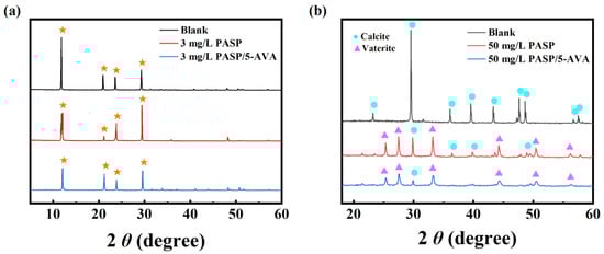 To investigate the action mechanism of the scale inhibitors, the CaCO3 and CaSO4 crystals were studied using XRD to monitor their crystalline phase changes. The XRD spectrums of CaCO3 and CaSO4 in the presence and absence of the scale inhibitor are shown in Figure 5. As seen in Figure 5a, the peaks for CaSO4 were located at 12.04°, 21.78°, 23.45°, and 29.69° in the absence of inhibitor. The peak intensity was high and sharp, indicating higher crystallinity and larger particles. The XRD diffraction peak positions of CaSO4 did not change significantly when PASP or PASP/5–AVA was added. However, compared to the diffraction peaks without the inhibitor, whether the PASP or PASP/5–AVA was added, it would result in a decrease in peak height and some broadening, especially for PASP/5–AVA. This suggests that the addition of PASP reduces the size and crystallinity of the grains and that the extension of the side chains increases the potency of PASP. Combined with the SEM results of the CaSO4 scales, this further suggests that PASP/5–AVA does not alter the internal structure of CaSO4 scale crystals but merely hinders crystal growth by adsorbing more Ca2+ ions.