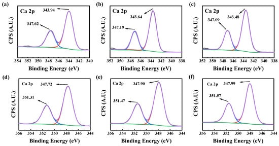 When the scale inhibitor was absent, the peaks at 347.62 and 343.94 eV were Ca 2p1/2 and Ca 2p3/2 peaks of the CaCO3 scale, respectively (Figure 6a–c). With 30 mg/L PASP in the solution, the binding energies of Ca 2p1/2 and Ca 2p3/2 were 0.43 eV and 0.3 eV lower than that without the scale inhibitor, respectively. When 30 mg/L of PASP/5–AVA was added, the binding energies of Ca 2p1/2 and Ca 2p3/2 decreased by 0.53 eV and 0.46 eV, respectively. The binding energies change of Ca 2p1/2 and Ca 2p3/2 suggested that PASP or PASP/5–AVA changed the chemical environment of Ca2+ ions in the CaCO3 scale; the decrease of binding energy further indicated the formation rate of CaCO3 crystals was slowed down, thus reducing the formation of CaCO3 scales. Lengthening of the side chains increased the lattice distortion ability of PASP on the CaCO3 scale, resulting in significant displacement.