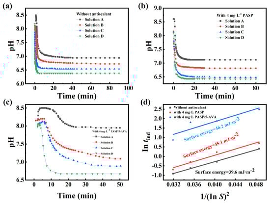 Furthermore, to further explore the mechanism of PASP/5–AVA, the pH changes in solution during CaCO3 scale growth by PASP and PASP/5–AVA were tested with a pH meter. Specifically, to determine the induction time (tind) of CaCO3 scale formation, the pH changes of the solution were monitored at four different supersaturation ratios (S) of CaCO3 solutions with and without the scale inhibitor. The concentrations of CaCO3 in the four solutions (A, B, C, and D) were 0.015 mol/L, 0.02 mol/L, 0.025 mol/L, and 0.03 mol/L, respectively. The relationship curves are described in Figure 7. Table 2 shows the tind for solutions without scale inhibitors and with different dosages of scale inhibitors (Figure 7a).