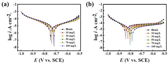The ability of PASP and PASP/5–AVA to inhibit electrochemical corrosion on carbon steel was studied at different concentrations with a CHI 660E electrochemical workstation, a three-electrode system, and the corrosion medium was 3.5% NaCl solution (298 K) []. The counter electrode and the reference electrode were a platinum electrode (2 cm2) and a saturated calomel electrode, respectively. The working electrode was 1 cm2 of an epoxy-clad 20# carbon steel. Before the experiment began, the working electrode was polished with sandpapers of different specifications (400–2000 mesh) to ensure a smooth surface, cleaned with acetone, and dried. Before the tests, to determine the steady-state open circuit potential (EOCP), the electrode was immersed in 500 mL corrosion solution for 1 h. Potentiodynamic polarization was tested at a scan rate of 1 mv/s within the potential range ±250 mV EOCP. The metal surface coverage (θ) and inhibition efficiency (ηp) were obtained from Tafel curves, which were calculated with Formulas (3) and (4), respectively.