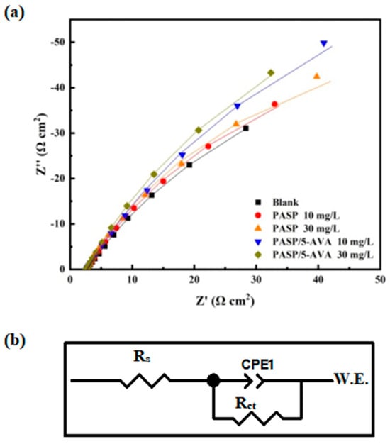 Impedance graph (a) for PASP and PASP/5–AVA with different concentrations and the corre-sponding analog equivalent circuit model (b).