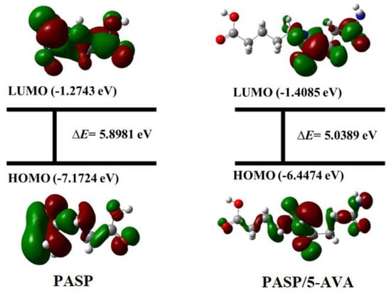 The geometrically optimized structures and molecular orbital density distribution of PASP and PASP/5–AVA according to quantum chemical calculation results.
