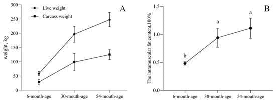The dynamics of the live weight (A) and the intramuscular fat (IMF) content (B) across 6, 30, and 54 months of age. Different letters (a, b) indicate significant differences between different growth stages (p < 0.05).