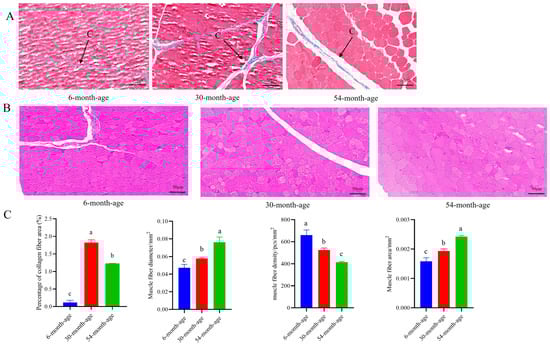 Collagen fiber staining and HE staining of Tianzhu white yak muscle tissue. (A) C represents collagen fibers. (B) Red represents a single muscle fiber. (C) Different lowercase letters indicate significant differences (p < 0.05).