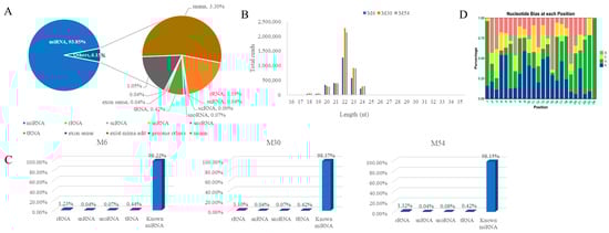 The type of identification and characterization analysis of small RNA. (A) Statistical analysis of the types of small RNA fragments after comparison with the database, including miRNA (existing miRNAs, known miRNAs, and novel miRNAs), rRNA, scRNA, snRNA, snoRNA, tRNA, exon sense, miRNA editing, other genome, and unann. (B) Statistical analysis of small RNA fragment size. (C) The type and percentage of small RNA in M6, M30, and M54 longissimus dorsi muscle tissues. (D) miRNA base preference in M6, M30, and M54 longissimus dorsi muscle tissues.