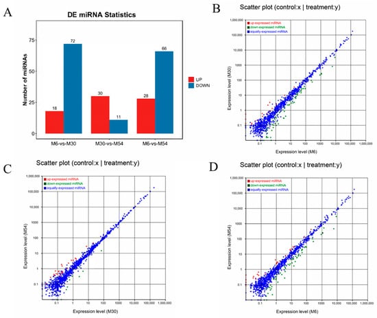 Statistical analysis of DE miRNAs. Note: Scatter plots show up- and downregulated DE miRNAs between groups, with the horizontal coordinates showing the expression levels in the control group and the vertical coordinates showing the expression levels in the test group. Red color indicates upregulated miRNAs, green color indicates downregulated miRNAs, and blue color indicates co-expressed miRNAs. (A) Number of up- and downregulated DE miRNAs in 3 groups of Tianzhu white yak. (B) Scatter plot of DE miRNAs relative to M6 at M30. (C) Scatter plot of DE miRNAs relative to M30 at M54. (D) Scatter plot of DE miRNAs relative to M6 at M54.