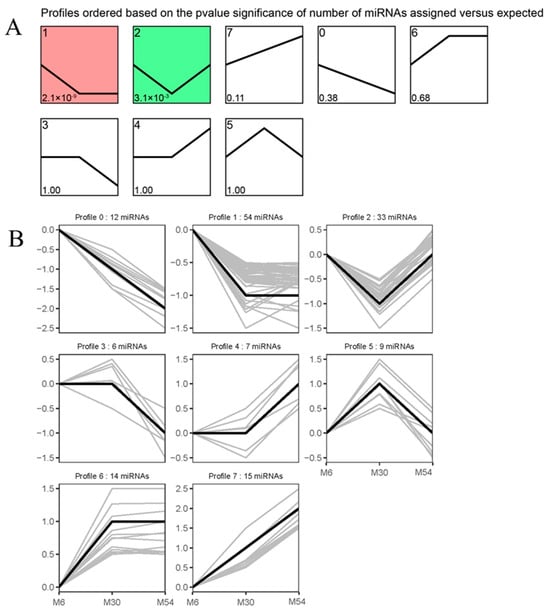 To determine temporal gene expression patterns, we used the STEM program to categorize the 159 DE miRNAs that were differentially expressed in M6 versus M30, M30 versus M54, and M6 versus M54 into eight possible expression profiles; the two expression patterns differed significantly during longissimus dorsi muscle tissue development (p < 0.05; Figure 6A). The integration of DE miRNAs contained in sub-trends Profile 1 and Profile 2 is noted as class-up (87 DE miRNAs) (p < 0.05; Figure 6B).