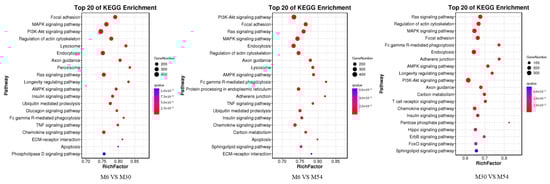 The screening results of DE miRNAs between groups are shown in Figure 4A (Table S2). A total of 90 DE miRNAs (18 upregulated, 72 downregulated) were identified in the M30 group relative to M6 (Figure 4A,B); a total of 41 DE miRNAs (30 upregulated, 11 downregulated) were identified in the M54 group relative to M30 (Figure 4A,C); and a total of 94 DE miRNAs (28 upregulated, 66 downregulated) were identified in the M54 group relative to M6 (Figure 4A,D).