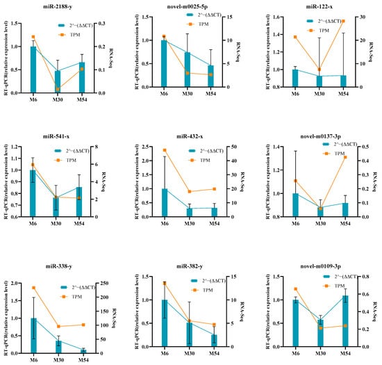 We randomly selected nine miRNAs for RT-qPCR validation to verify the DE miRNAs. Comparison of the miRNA expression levels with the RNA-Seq data showed similar patterns (Figure 9), suggesting that the RNA-Seq data were credible.