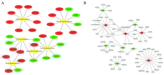 In order to further explore the molecular mechanisms by which DE miRNAs regulate intramuscular fat development in yak, the most significantly upregulated and the most significantly downregulated miRNAs were selected and combined with the results of the target gene prediction, and the miRNA–mRNA regulatory network was constructed using Cytoscape v3.7.1 software [].