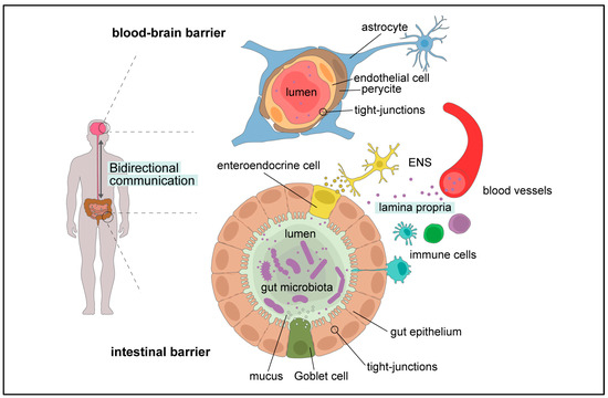 Bidirectional communication network between the gut and brain depicting cross-talk between two semi-permeable barriers: the intestinal barrier and blood–brain barrier; ENS—enteric nervous system.