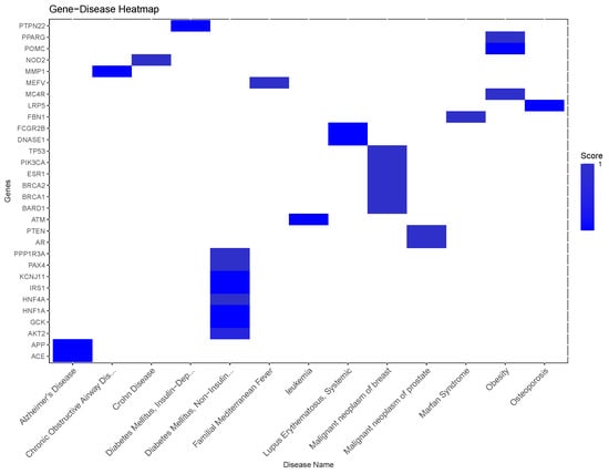 Diseases such as Alzheimer’s disease, depressive disorder, and breast carcinoma have a high degree of gene overlap with periodontitis, indicating closer molecular associations. In contrast, conditions like acute coronary syndrome and adrenal gland hypofunction show limited gene overlap, though even minimal shared genes can indicate significant molecular connections. The distribution of shared genes highlights the complexity of disease interactions (Figure 4) and underscores the multifactorial nature of both periodontitis and systemic diseases.