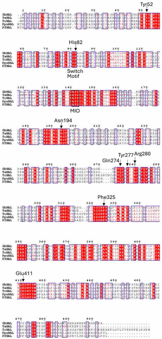 Sequence alignment for histidine ammonia-lyases of contrasted activity. GkHAL, Geobacillus kaustophilus CECT4264, Genbank acc. No. PQ065632; TaHAL, Thermoplasma acidophilum, Uniprot Q9HLI6; TcHAL, Trypanosoma cruzi, Uniprot Q4E133; PpuHAL, Pseudomonas putida, Uniprot P21310; PfHAL, Pseudomonas fluorescens, NCBI Reference Sequence No. WP_003220818.1.