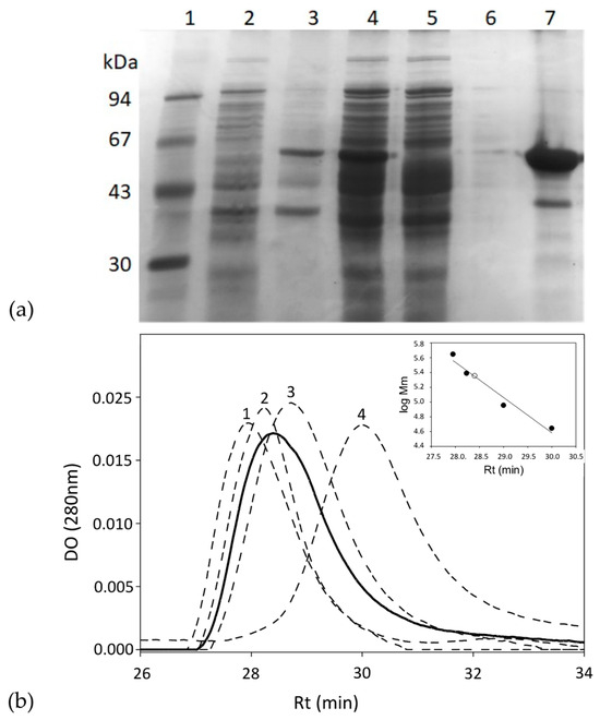 Size-exclusion chromatography–high-pressure liquid chromatography (SEC-HPLC) analysis was conducted to determine the molecular mass of both the wild-type and mutated GkHAL enzymes in their native states. The HPLC System (Breeze HPLC System, Waters, Barcelona, Spain) used a Biosep-SEC-S2000 column (Phenomenex, Madrid, Spain) that was calibrated using a non-denatured protein molecular weight marker kit (Bio-Rad, Madrid, Spain) [38,47]. The molecular mass of the monomeric form of both the wild-type and mutated GkHAL enzymes was determined using sodium dodecyl-sulfate polyacrylamide gel electrophoresis (SDS-PAGE) with a low molecular weight marker kit (Cytiva, Marlborough, MA, USA).