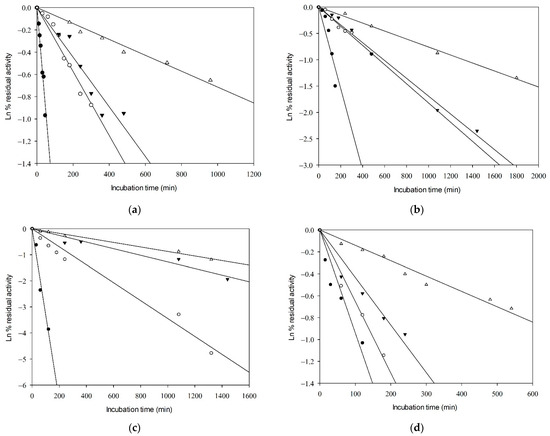 Thermal inactivation kinetics were determined by performing the standard assay with previous incubations of the enzymes at 65, 70, 75, and 80 °C. Pre-incubation times vary from 5 min to 60 min for higher temperatures and from 1 to 24 h for lower temperatures. The inactivation rate constant (kd) of the enzymes was determined using relative residual activities fitted to Arrhenius plots. The half-life value (t1/2) of the enzymes at a particular temperature was then determined from each kd. Activation parameters, including activation energy for denaturation and changes in enthalpy, free energy, and entropy for each incubation temperature, were determined as outlined in references [42,44,45,57].