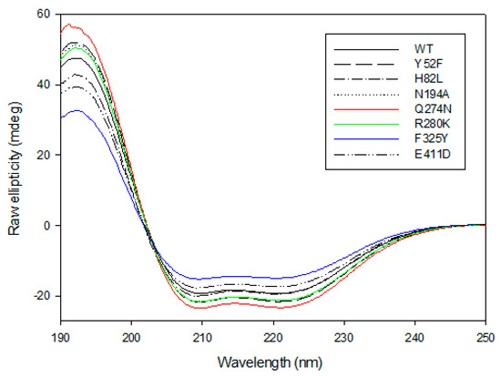 The CD spectra of the wild-type GkHAL and its mutants have been investigated experimentally (Figure 4). The CD spectrum of GKHAL at pH 8.5 exhibits two negative peaks at 210 and 222 nm and a positive peak at 192 nm. This is characteristic of a protein with an α-helical or turn-like conformation content, as well as a fraction of β-sheet structure [43], suggesting that the purified protein adopts a well-defined folded structure. The loss of ellipticity at 222 nm is attributed to α-helical content, while the loss at 210 nm indicates the presence of β-sheets in the structure of the protein. As shown in Figure 4, all mutants clearly show structural helicity, indicating that they keep their internal chirality. However, except for the H82L mutant, whose spectrum completely overlaps with that of GkHAL, all other mutants show slight differences from the wild-type GkHAL. Since the mutants Y52F, H82L, N194D, and E411D lacked activity on L-histidine, we did not analyze their CD spectra. To assess the slight variations in the secondary structures of mutants Q274N, R280K, and F325Y in comparison to the wild-type GkHAL, we utilized the k2d algorithm available on DichroWeb [46]. This tool facilitated the determination of the percentages of α-helices, β-sheets, and random structures for each enzyme. Table 3 presents the deconvolution results, indicating the relative percentages of each secondary structure. Based on the CD data, the wild-type GkHAL exhibits a conformation comprising 47% α-helix structure, 15% β-sheet structure, and 38% random coil elements. For the structure of the R280K mutant, the amount of α-helix structure is considerably higher, while the amount of β-sheet structure is distinctly lower compared to the wild-type enzyme. In contrast, the α-helical content in the Q274N and F325Y mutants decreases significantly, from 47% to 39% and from 47% to 35%, respectively, while the β-sheet content increases compared to the wild-type GkHAL. Nonetheless, it is still difficult to ascertain whether these minor structural changes are connected to the newly observed activity in the R280K and F325Y mutants.