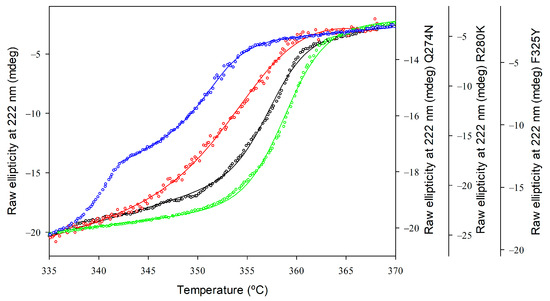 The thermostability of GkHAL variants was evaluated by observing temperature-induced unfolding using CD spectroscopy. Structural changes in protein folding were studied at a 4 µM protein concentration with a temperature interval of 62 and 95 °C, measuring the loss of ellipticity at 222 nm. Figure 5 presents the melting profiles of the variants, along with the associated non-linear least squares fit using the Gibbs–Helmholtz equation to determine the Tm values for each protein. For the wild-type GkHAL, a single sigmoidal transition was observed with an apparent Tm (Tm(app)) value of 357.36 ± 0.06 K, indicating that the thermal denaturation is a two-state process [47]. Compared to wild-type GkHAL, the R280K mutant not only displays an increase in helical content but also shows a modest improvement in thermal stability, with a Tm(app) value of 358.80 ± 0.04 K. In contrast, mutants like Q274N and F325Y, which have reduced helical content, exhibited a melting transition with a decrease in apparent melting temperature by 2.16 K and 5.51 K, respectively, compared to the wild-type (Table 3).