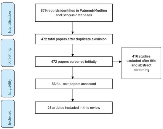 From the initial research, 679 articles were collected via PubMed/Medline and Scopus databases. A total of 472 were screened by title and abstract and 56 underwent full-text assessment. Ultimately, 28 articles were suitable for providing information in this literature review. The study selection process is depicted in Figure 1.