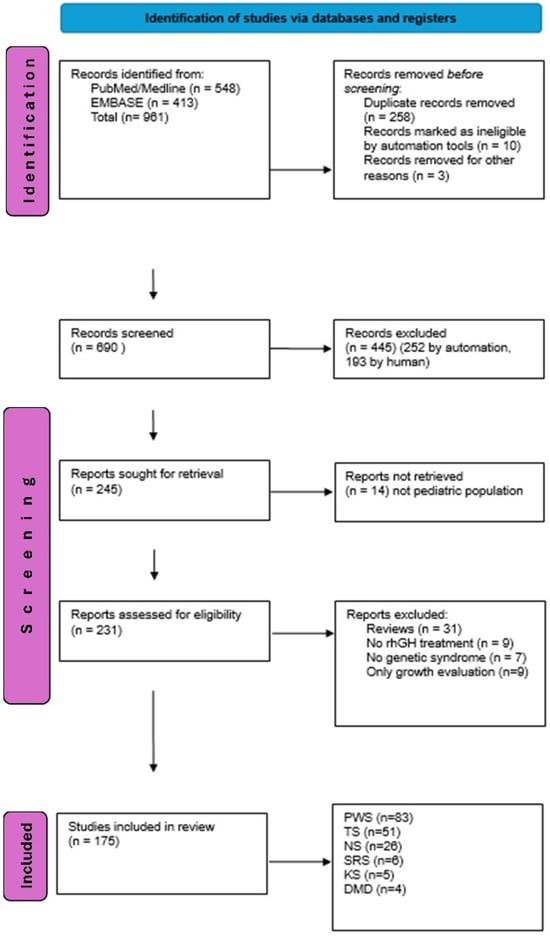 The initial search resulted in 961 references. Articles that did not report on GH treatment in genetic syndromes were excluded based on the title/abstract (445 articles). The remaining records were screened for inclusion criteria. After excluding duplicates (EndNote program and then manually), 231 potentially eligible studies were retrieved for full-text screening. For our final evaluation, we included 175 papers in the review (Figure 1). As expected, most of them concerned children with PWS, TS, and NS (83, 51, and 26 papers, respectively). A small number of papers focused on rhGH effects beyond growth promotion in SRS (n = 6), KS (n = 5), and DMD (n = 4) individuals.