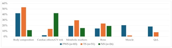 Comparison between percentage of papers regarding rhGH effects beyond growth promotion among PWS (% of 83 papers), TS (% of 51 papers), and NS (% of 26 papers). PWS—Prader–Willi syndrome; TS—Turner syndrome; NS—Noonan syndrome.