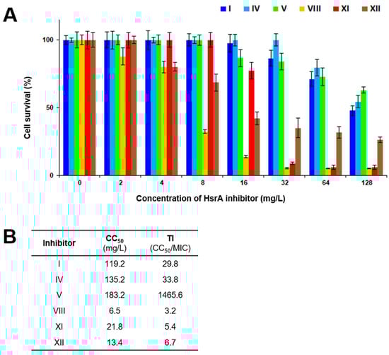 2.5. HsrA Bactericidal Inhibitors Exhibited Low Antimicrobial Actions against Gram-Positive and Gram-Negative Species of Human Microbiota