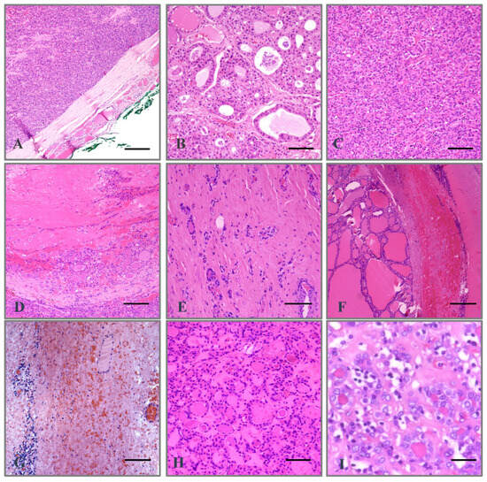 - Pizzimenti, C.; Fiorentino, V.; Ieni, A.; Martini, M.; Tuccari, G.; Lentini, M.; Fadda, G. Aggressive variants of follicular cell-derived thyroid carcinoma: An overview. Endocrine 2022, 78, 1–12. [Google Scholar] [CrossRef]
