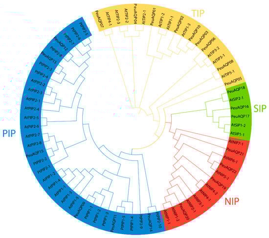 Using the keyword “aquaporin or MIP”, a total of 56 gene sequences were acquired from the NCBI databank (www.ncbi.nlm.nih.gov/protein, accessed on 19 April 2024). Of these, 22 AQP genes (PeuAQPs) had two NPA motifs and one complete MIP domain (Table S1). Sequence cluster studies of P. trichocarpa, P. euphratica, and A. thaliana led to the classification of those PeuAQPs into four subfamilies: six PIPs, nine TIPs, three SIPs, and four NIPs (Figure 1). The PIP1 and PIP2 subgroups, consisting of one PIP1 and four PIP2s, were part of the PIP subfamily. Three TIP1s, one TIP2, two TIP3s, one TIP4, and one TIP5 made up the five subgroups that comprised the TIPs subfamily. There were two subgroups in the SIPs subfamily: SIP1 and SIP2. There were three subgroups in the NIPs subfamily: two NIP1s, one NIP2, and one NIP5. PeuAQPs were named according to their chronological order in the NCBI protein database after removing redundant proteins. Amongst the 22 predicted PeuAQP proteins, the main protein was PeuNIP5;1, with 300 amino acids (Aas), whereas the least protein was PeuNIP1;1, with 196 Aas with an average length of 261.6 (Supplementary Materials Table S1a). The Zhang et al. protein database contained 50 potential AQP protein sequences, the longest of which ranged from 531 to 183 Aas (Supplementary Materials Table S1b). These fifty AQP protein sequences were discovered in Zhang et al.’s protein database, sixteen of which matched those reported by Ma et al. (Supplementary Materials Table S1a) as these proteins shared the same identical protein numbers. However, their sequence numbers were different to each other. There were three subgroups, including TIPs, PIPs, and NIPs, found in these fifty proteins reported by Zhang et al.; nevertheless, there were no SIP subgroups present in these protein sequences, as Ma et al. reported (as illustrated in Supplementary Materials Table S1a). We were able to identify 22 AQP proteins in P. euphratica by combining two protein databases, including these SIP subgroups, and renamed them whilst rendering gene ID on NCBI.
