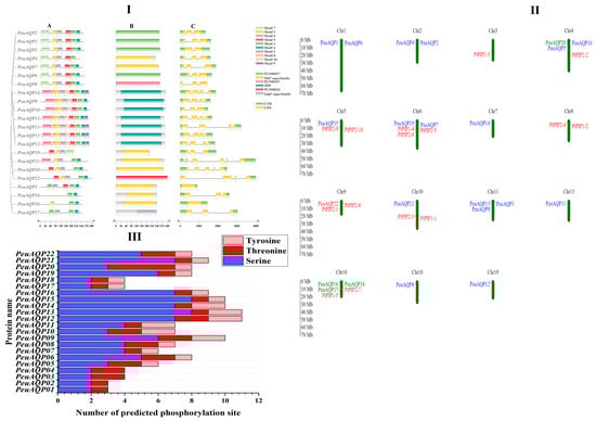 (I) Phylogenetic relationship, motif composition, domain, and gene structure of AQP genes in P. euphratica. (A) The multiple positions of full-length AQP protein sequences from three species were acquired via Clustal W, and a phylogenetic tree was built with MEGA 7 by the neighbor-joining (NJ) method with 1000 bootstrap replicates. The depiction image of conserved motifs was acquired using motif elicitation (MEME) in AQP proteins. The 10-motif composition model in the PeuAQP whole amino acid sequences was primed by MEME.XML through TBtools software (Toolbox for Biologists v1.130, University of Science and Technology, Wuhan, China). Various motifs are represented by boxes of diverse colors. (B) Domain of AQP gene family analysis. (C) Exon/intron structure of the AQP genes. Green and yellow boxes indicate exons and gray lines represent introns of the AQP genes. (II) Chromosomal locations of AQP genes in poplars species. Twenty-two PeuAQP genes were found across chromosomes 1, 2, 3, 4, 5, 6, 7, 8, 9, 10, 11, 13, 16, 18, and 19. The corresponding chromosome numbers are shown at the uppermost section of every chromosome, respectively. (III) Depiction figure of predicted phosphorylation sites of PeuAQP proteins. Network analysis was carried out on serine, threonine, or tyrosine residues. Each network pocket site of same prediction was observed in each subfamily.