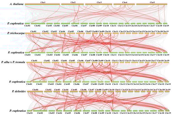 Comparative genomics analysis of AQP gene collinearity amongst P. euphratica and four demonstrative plants (A. thaliana, P. trichocarpa, P.alba x P. Tremula, and P. deltoides). The gray lines in the background designate blocks of collinearity inside P. euphratica and the designated plants, while the red lines specify homozygous AQP gene pairs.