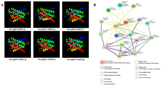 (A) The 3D structure analysis of the selected six PeuAQP genes in the subfamily of PIP. Modeled at a 100% confidence level by using Phyre2 server and the percentage residues ranged from 78 to 98%. (B) Schematic reveals the protein interaction network of PeuAQPs. Every node embodies a protein, and every edge characterizes an interaction.
