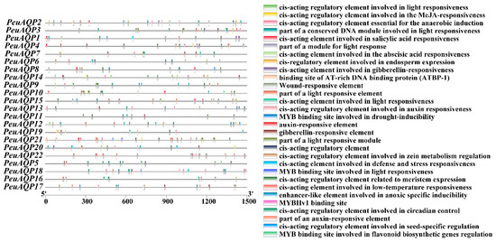 Cis-acting elements in the promoter region of the PeuAQP gene family. Distinct colored boxes denote diverse cis-elements.