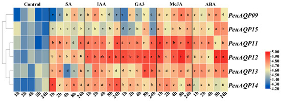 The relative expression analysis of the PeuAQP genes in response to SA, IAA, GA3, MeJA, and ABA treatments after 1 h, 2 h, 4 h, 8 h, and 24 h. They were conducted for the time (h) of each treatment. The heat map figure was based on the calculation of triplicates of qRT-PCR data and the transformation of the log2 algorithm. The letters a, b, c, d and e denote significant differences, and the least significant differences (LSDs) test was used to calculate the p-values (p ≤ 0.05).