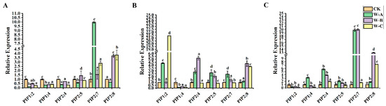 The expression analysis of PeuAQP genes in response to drought stress. Expression analysis of PeuAQPs in various tissues including (A) leaves, (B) stem, and (C) roots. The W-A (5 days), W-B (10 days), and W-C (20 days), respectively, represent four drought treatments with various soil volumetric water contents (soil-VWC): control (41 ± 1% soil-VWC), mild drought (31 ± 1% soil-VWC), moderate drought (21 ± 1% soil-VWC), and severe drought (11 ± 1% soil-VWC). Relative expression in the control was set 1. The PeuAQPs relative expression were analyzed vs. control (Duncan’s test and one-way ANOVA). Data were presented as mean ± standard error (SE). Error bars symbolize the standard deviations of three replicates. The letters a, b, c, and d denote significant differences, and the least significant differences (LSDs) test was used to calculate the p-values (p ≤ 0.05). Three biological repeats were used in this study.