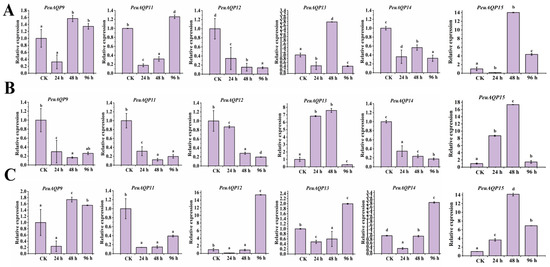 We also examined the expression patterns of six AQP gene family members under salt stress in order to understand the PeuAQP gene’s response to abiotic stress. The results in Figure 8 illustrate show that six PeuAQP genes exhibit variable degrees of salt stress response, and PeuAQP9 (PIP1;2), PeuAQP13 (PIP2;5), and PeuAQP15 (PIP2;8) expression was up-regulated after 48 h of NaCl treatment in leaves (Figure 8A). PeuAQP13 (PIP2;5) and PeuAQP15 (PIP2;8) expression was up-regulated and peaked after 24 h and 48 h of NaCl treatment but decreased at 96 h of NaCl treatment in stems (Figure 8B). Whereas the relative expression levels of NaCl in stems, PeuAQP13 (PIP2;5), and PeuAQP15 (PIP2;8) were markedly elevated, it peaked after 24 h and 48 h, and then declined after 96 h (Figure 8B). After 96 h of NaCl in roots, PeuAQP12 (PIP2;4), PeuAQP13 (PIP2;5), and PeuAQP14 (PIP2;7) showed a notable upregulation and peaked (Figure 8C). On the other hand, the expression levels of other AQP genes varied significantly, whereas PeuAQP12 (PIP2;4) was down-regulated in leaves, and PeuAQP12 (PIP2;4) and PeuAQP14 (PIP2;7) were down-regulated in stems. Furthermore, PeuAQP15 (PIP2;8) genes were up-regulated after 48 h and 96 h of NaCl treatment in roots, demonstrating that some AQP genes varied in the response of P. euphratica to salt stress. A cluster analysis discovered that the responses to the NaCl stimulation of PeuAQP genes belonging to the same evolutionary branch are quite comparable. These findings imply that the PeuAQP13 (PIP2;5) and PeuAQP15 (PIP2;8) genes may interact in response to NaCl stress, even if they may have distinct roles and functions at various periods. Both of these genes may be important in the response to NaCl stress.