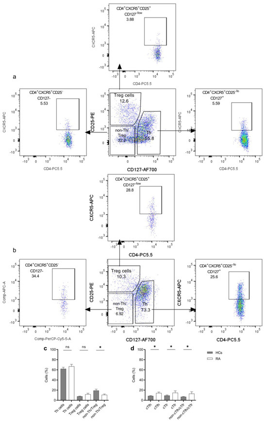 We measured the frequency of the Th cells (CD4+CD127+CD25−/lo), Treg cells (CD4+CD127−/loCD25+), and non-Th/Treg cells (CD4+CD127-CD25−), and within these subsets, we also evaluated the frequency of circulating follicular helper T (cTfh) cells (CD4+CXCR5+CD127+CD25−/lo), circulating follicular regulatory T (cTfr) cells (CD4+CXCR5+CD127−/loCD25+) and non-cTfh/cTfr cells (CD4+CXCR5+CD127−CD25−), respectively, among the HCs and RA patients (Figure 1a,b and Figure S1a,b). The frequency of Th and Treg cells was similar between the two groups, while the non-Th/Treg cells were significantly higher in HCs (Figure 1c).
