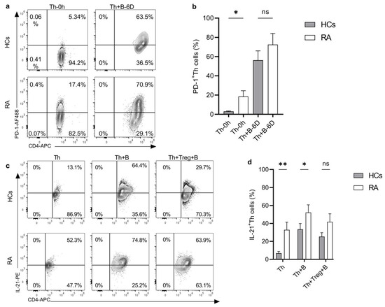 In recent years, it has been demonstrated that the PD-1 expression on the peripheral blood T cells of RA patients positively correlates with the disease activity score [29]. Furthermore, a significantly elevated number of circulating PD-1hiCD4+T cells that promote B-cell differentiation via secreting IL-21 were detected in RA patients compared to HCs. [30]. Therefore, we investigated the basal level of PD-1 expression on freshly isolated Th cells and in SEB-stimulated Th cells from the co-cultures with autologous B cells. In concert with previous findings, we have found a significantly higher PD-1 expression on Th cells from RA patients compared to HCs, and this was significantly upregulated in SEB-stimulated co-cultures with B cells in both groups (Figure 2a,b and Figure S2). Next, we evaluated the intracellular IL-21 production by Th cells in the same setting, after 6 days of stimulation with SEB alone, and in a co-culture with B cells. An example of full gating is shown in Figure S3. We have found a significantly elevated frequency of IL-21-producing Th cells in RA patients’ samples (32.8% ± 8.6%) compared to healthy individuals (6.9% ± 1.96%), indicating a constitutive IL-21 production in RA (Figure 2c,d). In the co-cultures (Th+B cell), IL-21 production was upregulated in both HCs and RA patients’ samples, with 33.41% ± 6.5% and 52.2% ± 8.5%, respectively, and by comparing the two groups, Th cells from RA patients showed a significantly higher IL-21 production compared to HCs. (Figure 2c,d). Additionally, we evaluated the IL-21 expression in the presence of cognate Treg cells in triple cultures. IL-21 production tends to be downregulated by Treg cells in both HCs and RA patients’ samples, but no significant differences were observed (Figure 2c,d). Thus, Th cells from RA patients are highly active and more susceptible to stimulation, resulting in a higher level of IL-21 production compared to HCs, while Treg cells from both groups did not significantly reduce the IL-21 production.