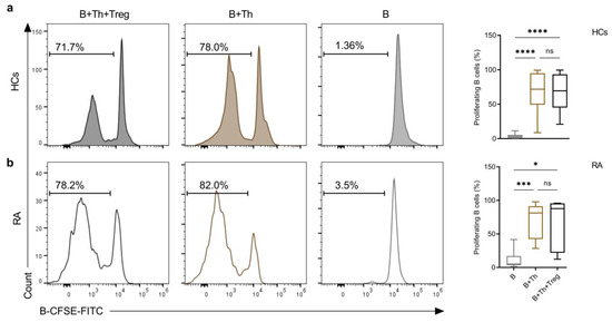 Th-cell-induced proliferation of B cells from HCs (a) and RA (b) patients. (a) and (b) Histograms depict a flow cytometric analysis of B-cell proliferation from HCs and RA patients, respectively. Cells were uploaded with CFSE dye and stimulated in monoculture (B), co-culture (B+Th), or triple culture (B+Th+Treg) for six days in the presence of SEB superantigen (22 ng/mL). The bar charts show the evaluation of the results from at least (n = 5) independent experiments using ordinary one-way ANOVA with uncorrected Fisher’s LSD. The significance was taken as * p < 0.5, *** p < 0.001, **** p < 0.0001. ns: not significant.