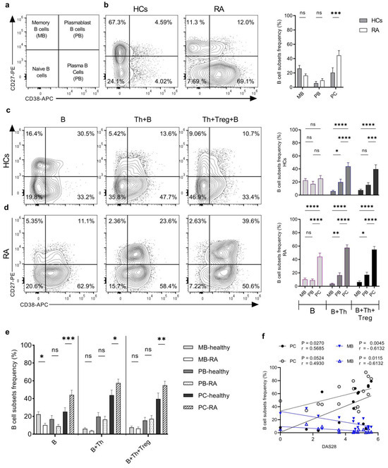 Th cells from RA patients induced differentiation and plasma cell generation from autologous B cells at a higher rate as compared to HCs. (a) Illustration of B-cell subsets, memory B cells (MB), plasma blast (PB), and plasma cells (PC) distribution in different quadrants according to CD19, CD27, and CD38 expression. (b) A representative example of flow cytometric analysis of the distribution of B-cell subsets, within freshly isolated CD19+ B cells from the blood of HCs and RA patients. The quantifications in the bar chart show the averages from (n = 15) independent experiments. (c), Flow cytometric analysis of the distribution of B cell subsets from HCs’ and (d) RA patients’ samples, stimulated with SEB for 6 days in monoculture (B), co-culture with Th cells (B+Th), and in the presence of Treg cells (B+Th+Treg). Flow cytometric analysis of a representative experiment (left panels) and quantification of B-cell subset frequencies (bar charts) are shown: (HCs-MB; n = 19, PB; n = 19, PC; n = 16) and (RA-MB; n = 16, PB; n = 16, PC; n = 14). (e) Accumulative bar chart comparing the distribution of MB, PB, and PC subsets between HCs and RA patients within the same culture systems. The number of cells per subset was 5 × 104 cells, and a 1:1 ratio was applied in the cases of coculture and triple culture. The statistical model ordinary two-way ANOVA with uncorrected Fisher’s LSD was used and the significance was evaluated as * p < 0.5, ** p < 0.01, *** p < 0.001, **** p < 0.0001. ns: not significant. (f) Correlation between the frequencies of plasma cells and memory B cells, respectively, and the disease activity score (DAS 28) of RA patients, the two upward lines correspond to plasma cells (PC) before stimulation (black filled circle) and after stimulation (black open circle). The two downward lines represent memory B cells (MB) before stimulation (blue filled triangle) and after stimulation (blue open triangle).