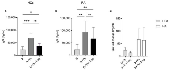 Activated Th cells from RA patients (b,c) induce higher IgG production when cocultured with autologous B cells as compared to HCs (a,c). IgG production was evaluated from the harvested supernatant of (B), (B+Th), and (B+Th+Treg) cell cultures by ELISA. IgG produced by B cells in monoculture was used to calculate the fold change. All culture systems were prepared as in (Figure 4). The quantification was applied for (n = 21) independent measurements for HCs and (n = 14) for RA patients (mean % ± S.E.M.). The Kruskal–Wallis test with uncorrected Dunn’s test was used for evaluation * p < 0.5, ** p < 0.01, *** p < 0.001. ns: not significant.