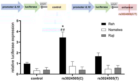 The presence of a risk rs3024505(T) allele abrogates interleukin 10 (IL10) enhancer activity in stimulated Reh cells. Up: Enhancer region containing common (C) or minor (T) alleles of rs3024505 or irrelevant non-enhancer control fragment was cloned downstream of the luciferase gene placed under the IL10 promoter in the pGL3-basic vector. Down: Relative luciferase activity in Reh, Namalwa, and Raji cells transfected with constructs containing IL10 promoter and enhancer with alternative rs3024505 alleles or control sequence. All data were normalized to Renilla luciferase internal reference. Data from three independent experiments with mean values ± SEM, * p < 0.05—significant difference between SNP alleles; ## p < 0.01—significant difference between promoter activity in constructs containing enhancer with rs3024505(C) and control sequence, as calculated by two-way ANOVA.