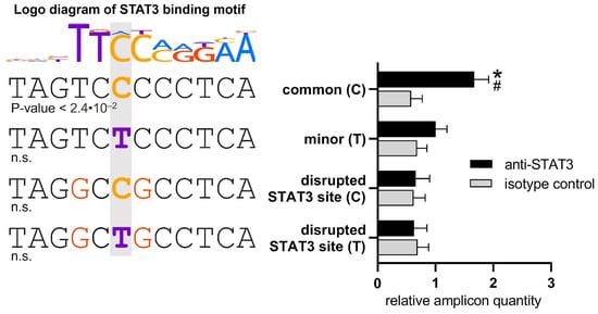 The common allele rs3024505(C) of enhancer creates a STAT3 binding site in stimulated Reh cells. (Left): The STAT3 motif logo from the HOCOMOCO v11 database aligned with the corresponding segments of the enhancer sequence with alternative rs3024505(C/T) alleles (highlighted in grey area) and mutated variants with a disrupted STAT3 binding site (nucleotide substitutions are in red). The motif p-values are indicated below the sequences, n.s.—non-significant. (Right): Pull-down assay with anti-STAT3 antibodies and nuclear extract from stimulated Reh cells. The amplicon amount was quantified by real-time qPCR, normalized to the value obtained with the negative control DNA fragment, and further normalized to the relative amplicon quantity of rs3024505(T) with anti-STAT3. The presented data represent three independent experiments with mean values ± SEM. * p < 0.05—compared to other amplicons precipitated by anti-STAT3, # p < 0.05—compared to isotype control, as calculated by two-way ANOVA.