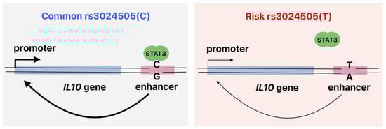 Common rs3024505(C) variant creates a STAT3 binding site, promoting IL10 enhancer activity in human B cells. The absence of STAT3 binding to the risk rs3024505(T) allele may lead to reduced IL10 production by B cells, potentially disrupting immune homeostasis and increasing the susceptibility to autoimmune diseases.