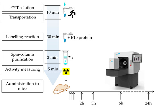 The experiment was conducted in a specially designed enclosure with a protective screen to adhere to safety regulations for handling radioactive materials. During the study, the 99mTc labelling procedure was repeated several times, and the resulting preparation could vary slightly in radioactivity (refer to Supplementary Table S4). We standardised the administered dose (~80 MBq for each mouse) by slightly varying the injection volume of the preparation. The typical labelling protocol is described below. Initially, 280 µL of a 99mTc solution (~995.4 MBq), 0.018 g (0.476 mmol) of NaBH4, and 700 µL (2.3 mg) of protein E1b were mixed to achieve a final volume of 1 mL. The mixture was then left to incubate for 30 min at room temperature (18–20 °C) before being desalted using Zeba™ Spin Desalting Columns with a 7K MWCO, as per the manufacturer’s instructions, using sterile saline at pH 7.2. The radioactivity of the eluate was immediately measured, and approximately 80 MBq (about 120 µL) of the eluate was injected intravenously into a mouse. A control group of mice was administered an equivalent radioactivity of free sodium 99mTc-pertechnetate.